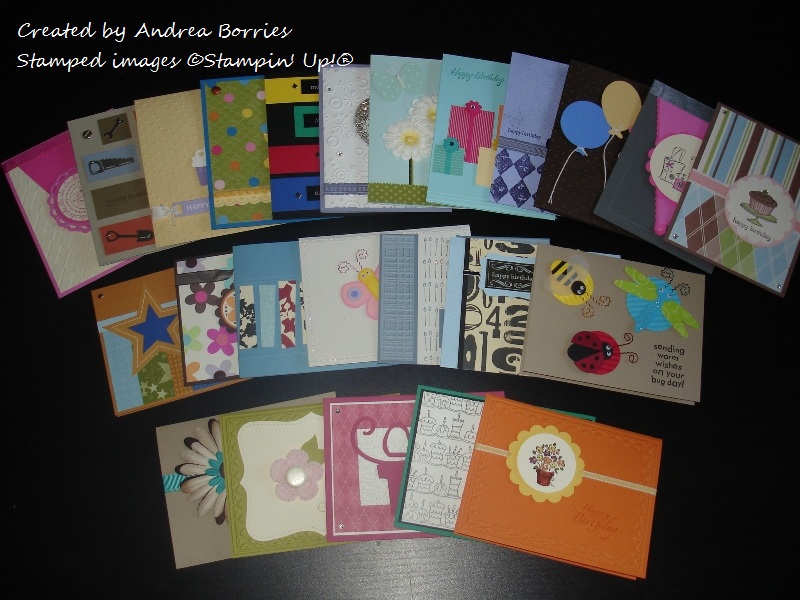 A couple of weeks ago I posted the picture of all the birthday cards I made as a gift for my grandma, and I mentioned that I would show individual pictures of some of the cards. I realized this morning that I've only posted one card so far - oops! So here are pictures and supplies for a few more of the cards, some of the ones that ended up being my favorites in the bunch. Note that all the supplies are from Stampin' Up!® unless otherwise noted in the supply lists.